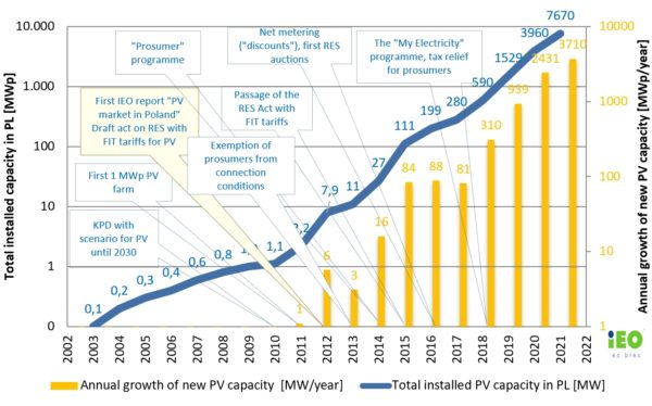 Regulatory changes and rising electricity prices resulted in a 'spectacular success' for Poland's PV industry in 2021, the IEO noted. Installed PV capacity at the end of 2021 was 7.6 GW, with growth of new capacity at more than 3.7 GW.